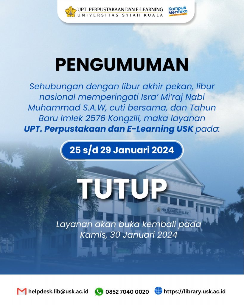 Banda Aceh, 24 Januari 2025 – Dalam rangka menyambut libur akhir pekan, libur nasional, serta cuti bersama, Perpustakaan dan layanan E-Learning Universitas Syiah Kuala (USK) akan menutup sementara operasionalnya. Penutupan layanan ini berlaku dari tanggal 25 hingga 29 Januari 2025, Read More …