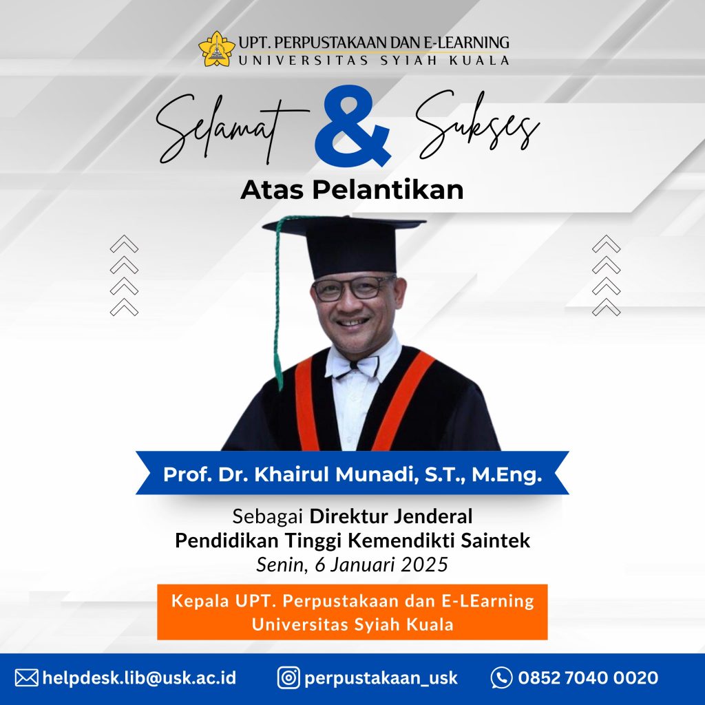 UPT Perpustakaan dan E-Learning USK kembali membuka kesempatan kepada mahasiswa baru angkatan 2024/2025 dan mahsiswa lama yang belum mengikuti kegiatan LOCT ini pada periode sebelumnya, dan dapat mengikuti kegiatan ini pada semester genap 2024/2025. Library Orientation Class and Tour (LOCT) Read More …