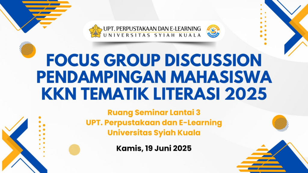 Banda Aceh, 19 Juni 2025 – Universitas Syiah Kuala (USK), melalui UPT Perpustakaan dan E-Learning, menggelar Focus Group Discussion (FGD) Pendampingan Mahasiswa Kuliah Kerja Nyata (KKN) Tematik Literasi Tahun 2025. Kegiatan ini berlangsung di Aula lantai 3 Perpustakaan dan E-Learning USK dan dihadiri oleh Kepala UPT Perpustakaan dan Pustakawan yang berfokus pada pengembangan literasi masyarakat.