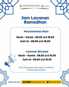 Berdasarkan Surat Edaran Nomor 4 Tahun 2026 tentang Penyesuaian Sistem Kerja Kedinasan pada Bulan Suci Ramadhan 1447 Hijriah serta dalam rangka Libur Nasional dan Cuti Bersama Hari Suci Nyepi (Tahun Baru Saka 1948) dan Hari Raya Idul Fitri 1447 Hijriah di Lingkungan Universitas Syiah Kuala, bersama ini disampaikan penyesuaian jam layanan Perpustakaan sebagai berikut: