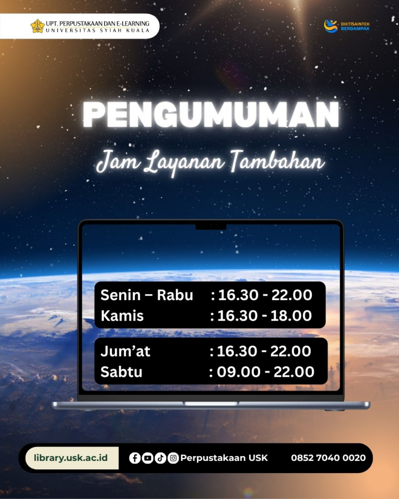 Guna meningkatkan kualitas layanan serta memberikan kemudahan akses bagi sivitas akademika Universitas Syiah Kuala, dengan ini kami informasikan bahwa mulai tanggal Senin, 1 Oktober 2025, UPT Perpustakaan dan E-Learning USK menambah jam operasional layanan sebagai berikut: