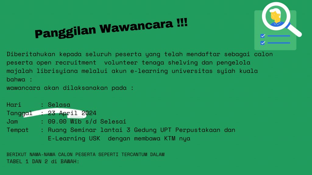 UPT Perpustakaan dan E-Learning USK dengan ini mengumumkan kepada para calon peserta volunteer yang telah memdaftar mellaui akun E-Learning usk untuk hadir pada sesi wawancara seperti yang tercantum pada slide di bawah. Demikian dan atas perhatinnya kami ucapkan terimkasih