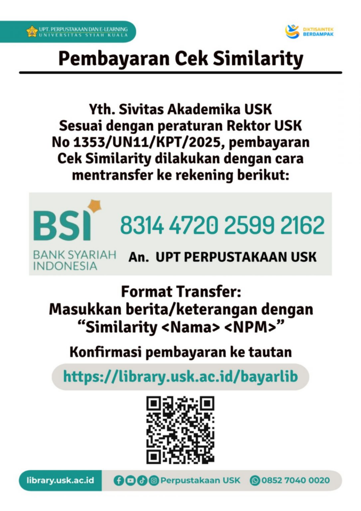 Yth, civitas akademika USK, berikut kami sampaikan informasi tentang tata cara pembayaran biaya cek similarity di perpustakaan dan e-learning, maka pembayaran biaya dapat dilakukan melalui bank BSI dengan nomor rekening : 8314 4720 2599 2162 An. UPT. PERPUSTAKAAN DAN E-LEARNING USK.