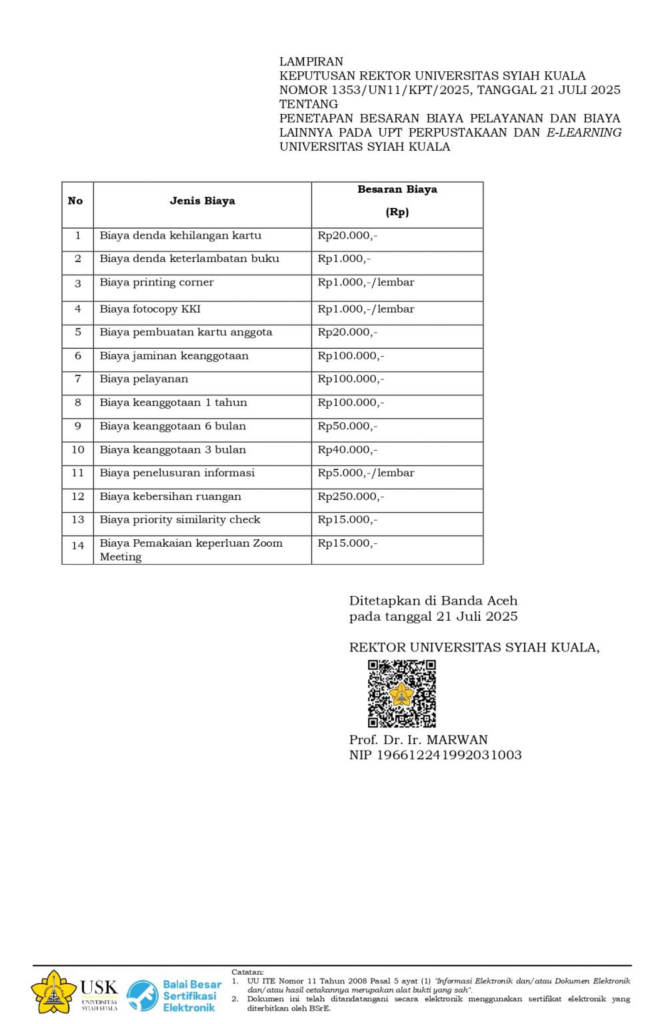 Sehubungan dengan peningkatan layanan dan pengelolaan sumber daya di UPT Perpustakaan dan e-Learning Universitas Syiah Kuala, bersama ini kami informasikan bahwa telah ditetapkan biaya pelayanan tertentu untuk beberapa layanan khusus di tahun 2025. Sesuai dengan SK Rektor No : 1353/UN11/KPT/2025 TANGAL 21 JULI 2025, TENTANG PENETAPAN BIAYA PELAYANAN DAN BIAYA LAINNYA PADA UPT PERPUSTAKAAN DAN E-LEARNING USK TAHUN 2025