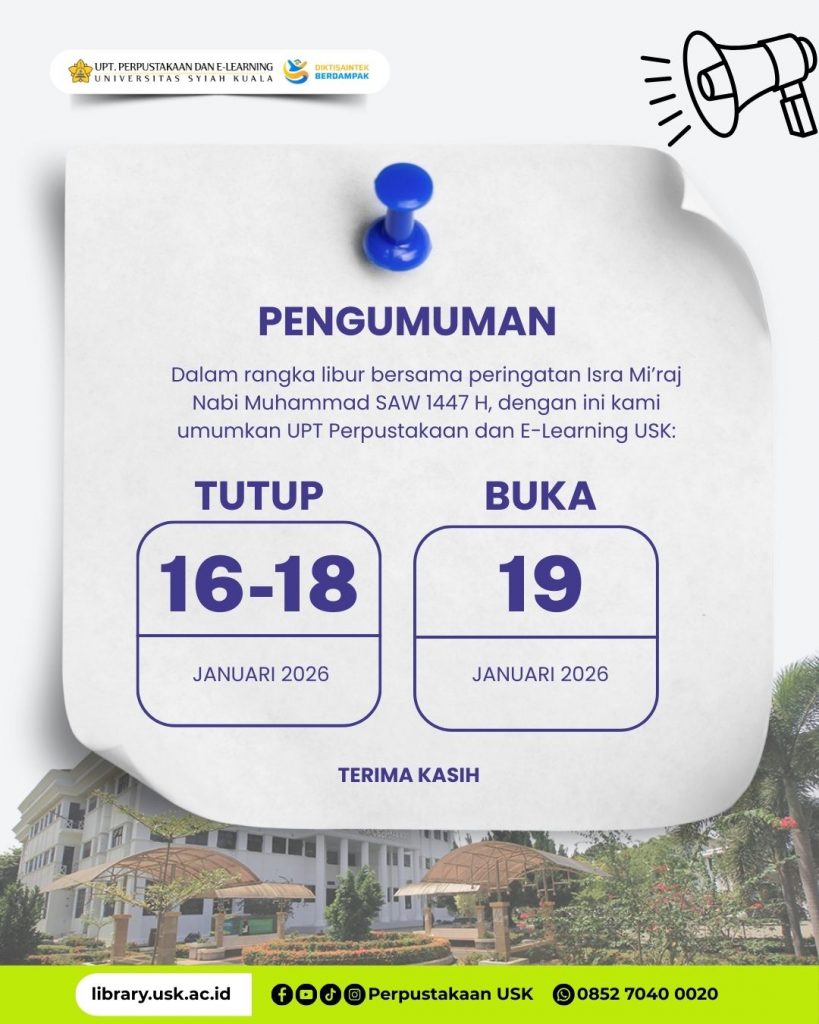 Sehubungan dengan peringatan Isra Mikraj Nabi Muhammad SAW, maka layanan Perpustakaan dan E-Learning USK akan diliburkan selama 3 (tiga) hari.