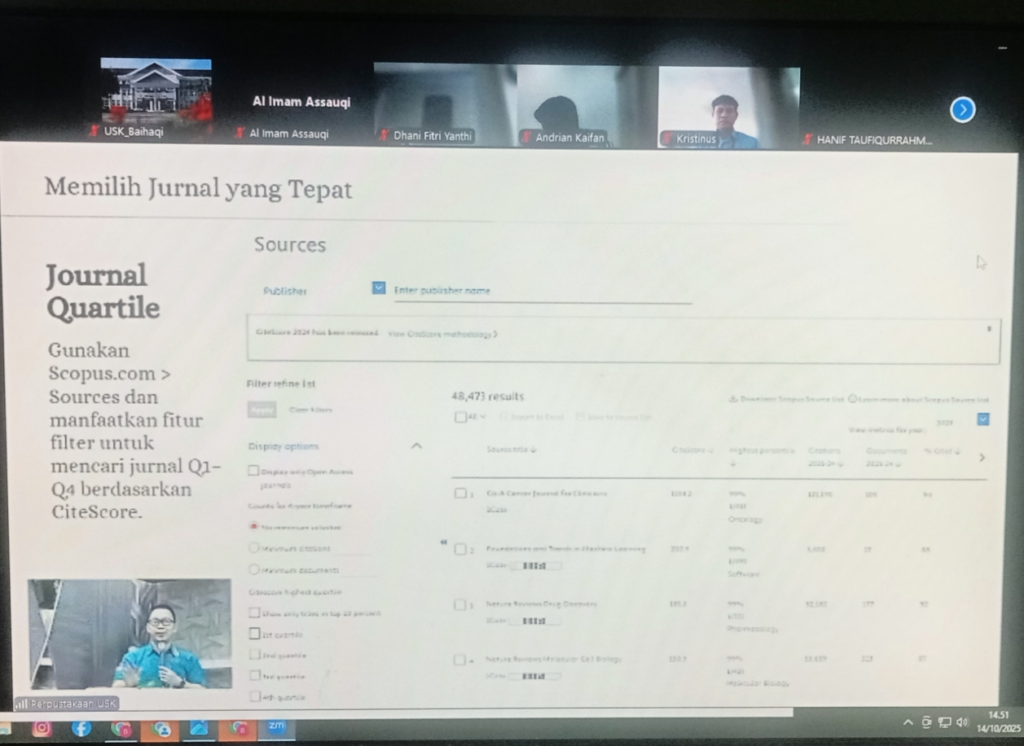 Kegiatan workshop juga dilengkapi dengan sesi tanya jawab interaktif, di mana para peserta berkesempatan berkonsultasi langsung mengenai tantangan yang mereka hadapi dalam proses publikasi. Antusiasme peserta terlihat tinggi, terbukti dari banyaknya pertanyaan yang diajukan, mulai dari teknis penulisan artikel hingga cara menghindari jurnal predator.