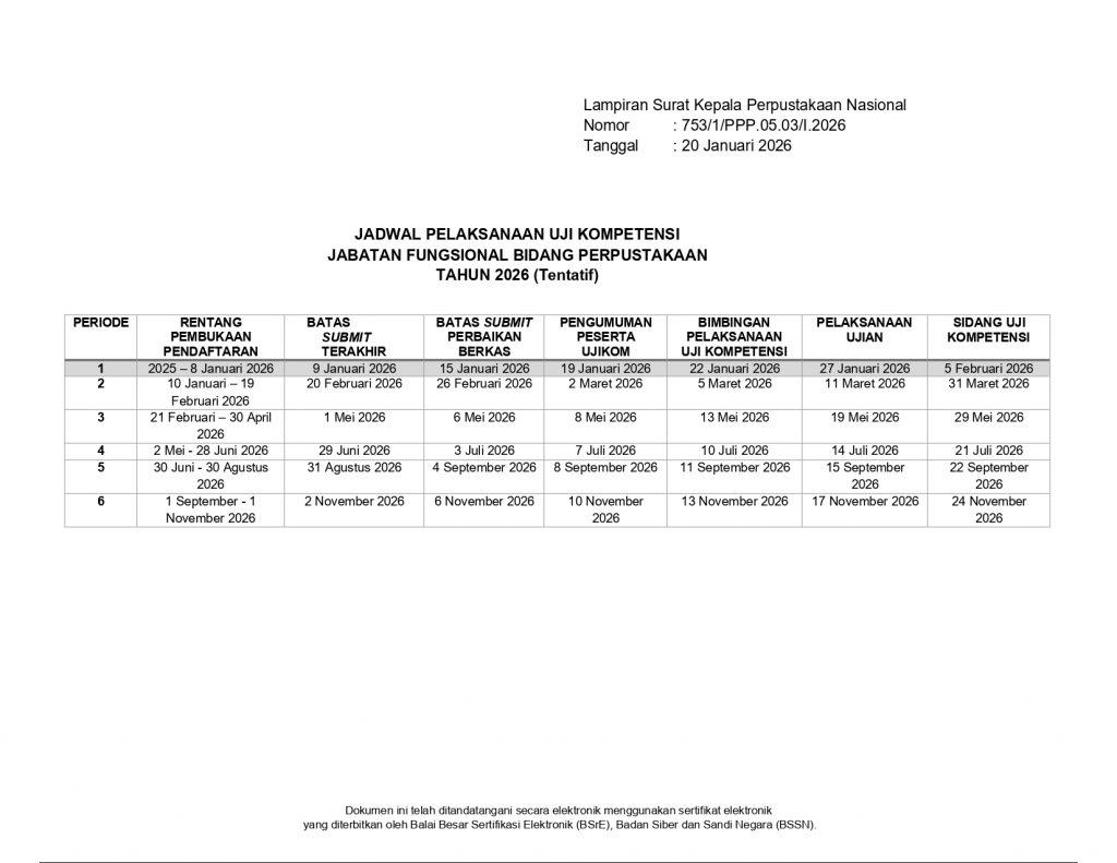Dalam surat Nomor 753/1/PPP.05.03/I.2026, Tanggal 20 Januari 2026 yang di tandatangani oleh Kepala Perpustakaan Nasional RI, Prof. E. Aminudin Azs ini, bertujuan sebagai acuan dalam perencanaan dan pengembangan kompetensi sumber daya manusia pada instansi pemerintah. Pelaksanaan uji kompetensi JFP akan dilaksanakan sebanyak 6 (enam) kali sepanjang tahun 2026 ini.