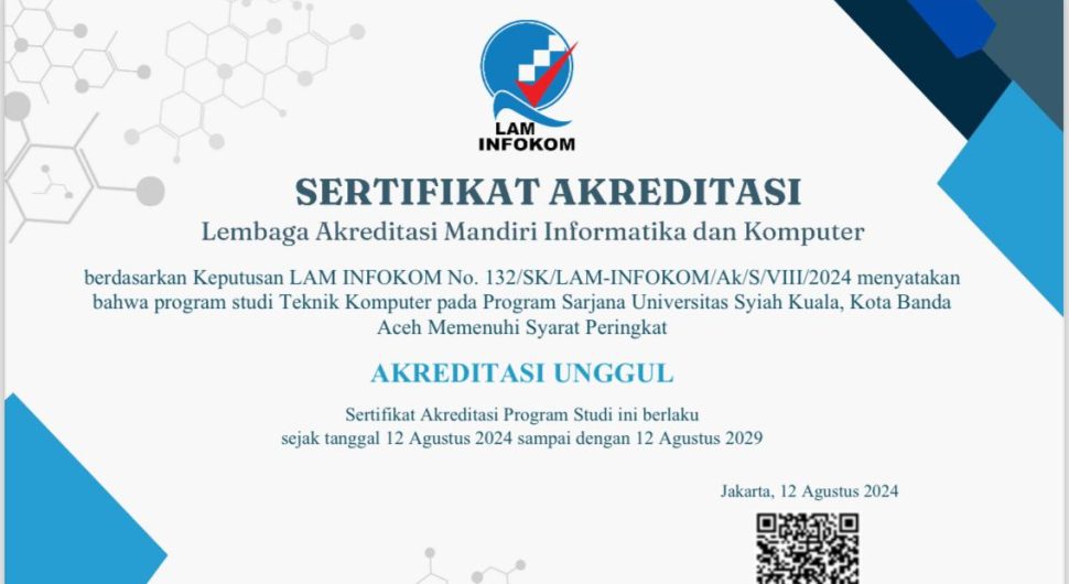Banda Aceh – Setelah melewati proses visitasi oleh tim asesor pada tanggal 30-31 Juli 2024 lalu, Program Studi S1 Teknik Komputer (PSTEKKOM) Departemen Teknik Elektro dan Komputer Fakultas Teknik Universitas Syiah Kuala (FT USK) berhasil meraih akreditasi “Unggul” dari Lembaga Akreditasi Mandiri Informatika dan Komputer (LAM INFOKOM). Hal ini berdasarkan hasil keputusan LAM INFOKOM No. 132/SK/LAM-INFOKOM/Ak/S/VIII/2024 dan menjadi sebuah pencapaian yang menegaskan kualitas pendidikan dan dedikasi dalam pengembangan teknologi di USK.
