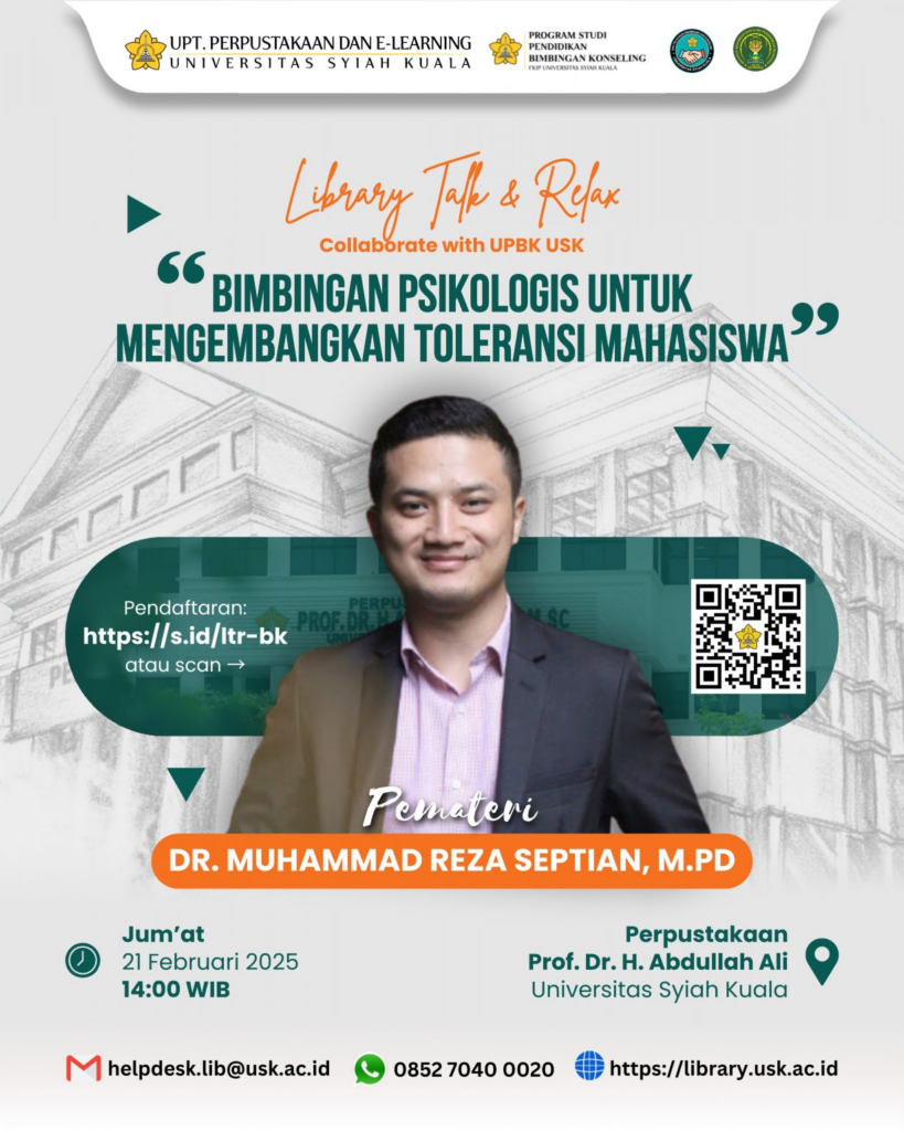 Banda Aceh, 19 Februari 2025 – Universitas Syiah Kuala (USK) mengadakan seminar bertema Bimbingan Psikologis untuk Membangun Toleransi Mahasiswa yang diselenggarakan oleh UPT Perpustakaan dan E-Learning kerja sama dengan Prodi Bimbingan Konseling FKIP. Seminar ini bertujuan untuk memberikan pemahaman yang lebih mendalam mengenai pentingnya toleransi antar mahasiswa, serta bagaimana bimbingan psikologis dapat membantu dalam proses pembentukan sikap toleransi yang sehat di lingkungan kampus.