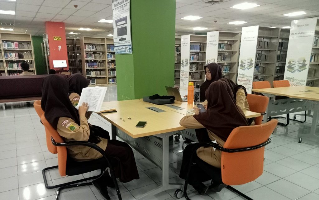 Selama diperpustakaan mereka mengunjungi ruang layanan Karya Ilmiah yang merupakan kumpulan koleksi ilmiah karya civitas akademika usk. Para siswa ini diajarkan cara mencari sumber informasi melalui halaman pencarian OPAC yang dipandu staf perpustakaan. Mereka di ajarkan cara mencari dan menemukan koleksi sesuai dengan topik yang dibutuhkan.