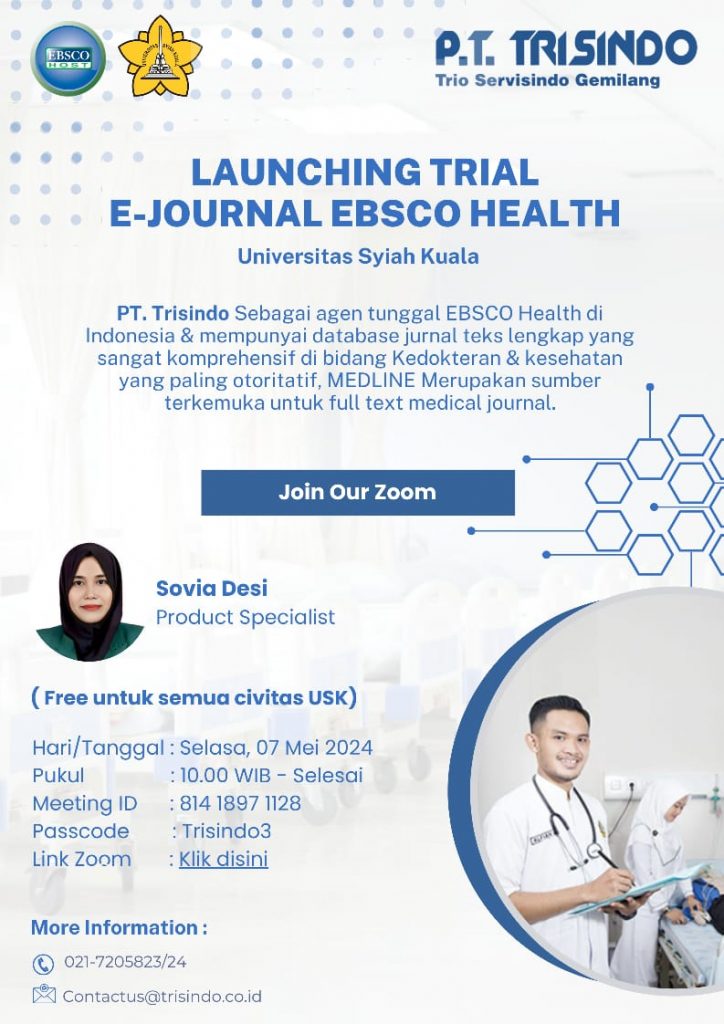 UPT. Perpustakaan dan E-Learning USK mengundang Bapak/Ibu beserta mahasiswa tingkat akhir di bawah perwalian/bimbingan Bapak/Ibu untuk mengikuti webinar bersama EBSCO Health “Launching Trial E-Journal EBSCO Health” yang akan dilaksanakan pada:Hari/Tanggal : Selasa, 7 Mei 2024Waktu : 10.00 WIB s/d selesaiTempat : Zoom Meeting (500 peserta)Pendaftaran Bapak/Ibu/Saudara melalui tautan klik https://uilis.usk.ac.id/ELUSK paling lambat Senin 6 Mei 2024 pukul 23.59 WIB. Untuk informasi teknis selanjutnya dapat meghubungi Service Desk http://wa.me/+6285270400020 atau Kabid. Pelayanan Pemustaka Sdr. Charlis Siana Rosita, S.Sos. http://wa.me/+6282165082569