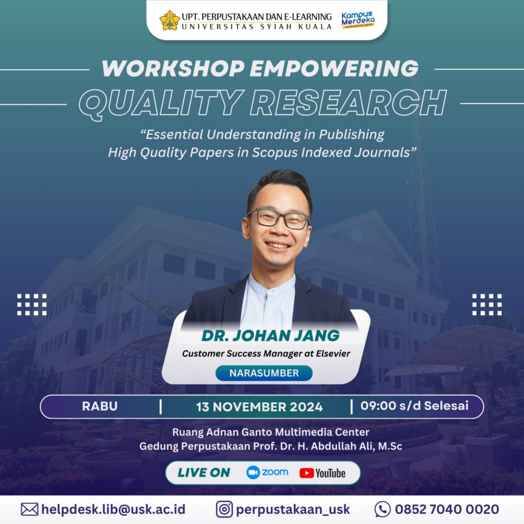 Banda Aceh, 13 November 2024 – Unit Pelaksana Teknis (UPT) Perpustakaan dan E-Learning Universitas Syiah Kuala (USK) menggelar sebuah workshop bertajuk \”Essential Understanding in Publishing High Quality Papers in Scopus Indexed Journals\” pada hari Rabu, 13 November 2024, pukul 09.00 Wib s/d selesai. Workshop ini bertujuan untuk memberikan pemahaman mendalam kepada para dosen, peneliti, dan mahasiswa tentang pentingnya kualitas publikasi ilmiah, serta bagaimana cara mempublikasikan artikel di jurnal-jurnal yang terindeks Scopus.